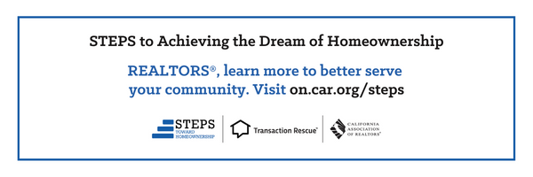 .The CALIFORNIA ASSOCIATION OF REALTORS® STEPS Toward Homeownership addresses housing affordability from the perspective of financial literacy. Did you know over half of all renters in California thought you needed at least 20% down to purchase a home? The reality is there are programs available that enable a purchase with much lower down payments. This program brings relevant information to our members about credit scores, financial planning, leveraging down payment resources and options for low to moderate income earners so that we can educate our buyers. The CALIFORNIA ASSOCIATION OF REALTORS® supports RESPONSIBLE Homeownership.